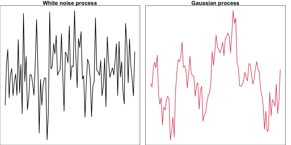 Here shows a two-dimensional white noises and a realization or sample path of a GP.