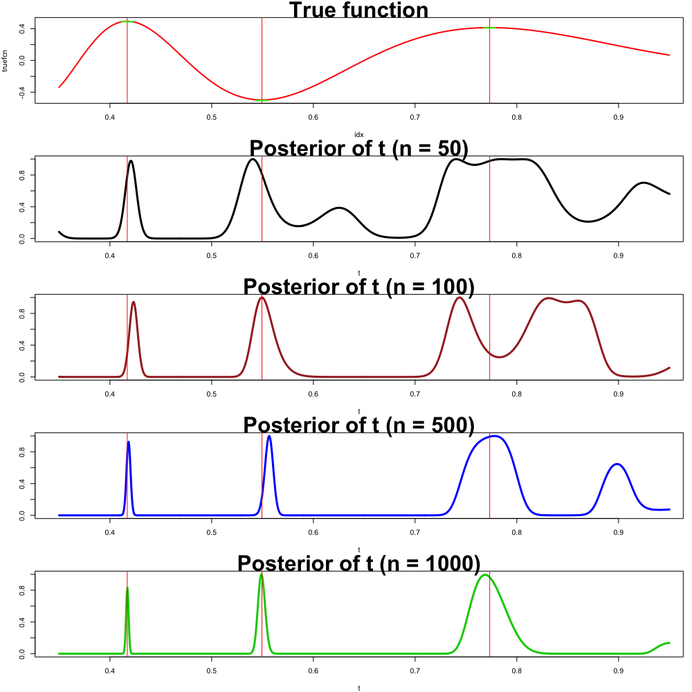 Theorem: The posterior of t converges to a mixture of Gaussians as n \rightarrow \infty , and the estimated number of mixture components converges to the number of stationary points.