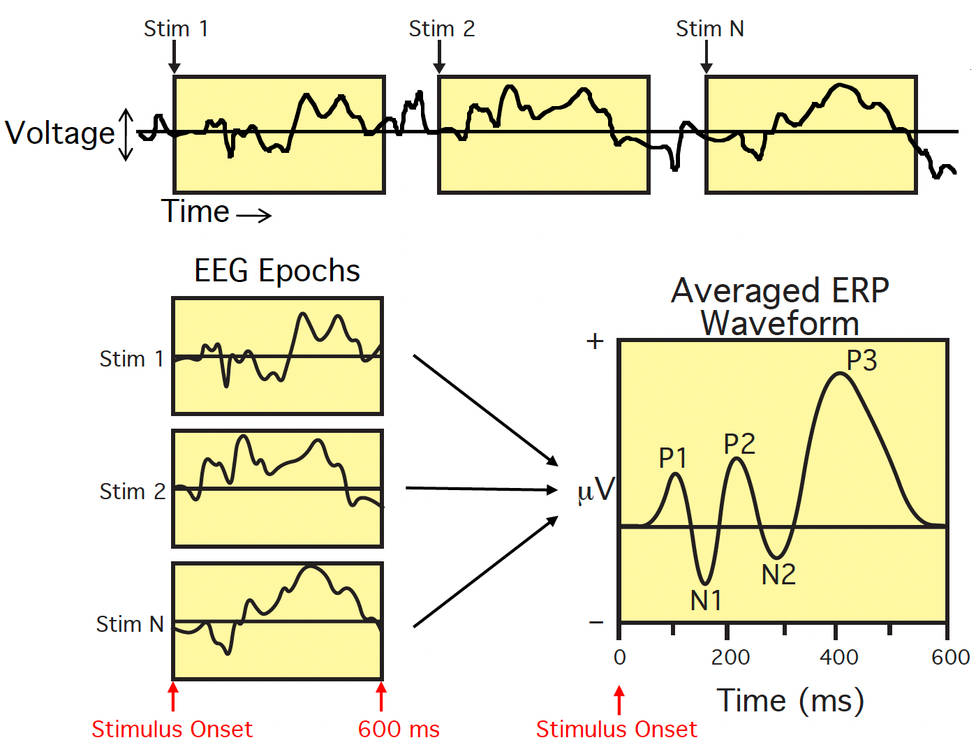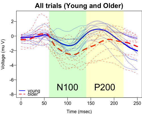 In order to obtain precise point estimates of latency and amplitude, or the entire ERP waveform, people tend to get the grand ERP waveform by averaging across subjects.