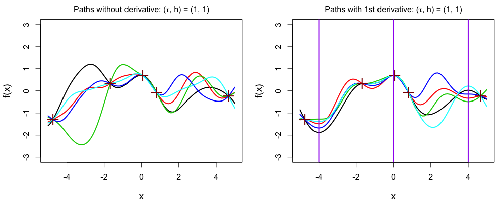 For example here on the left, we have GP sample paths of SE kernel without derivative constraints.