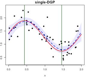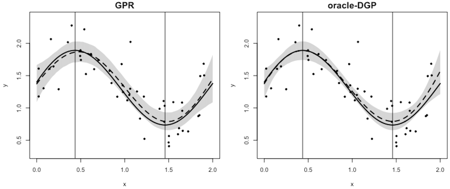 One thing I’d like to mention is that if the true s.p were known to us, which we called oracle DGP, its curve fitting would be better than the basic GPR. The reason is that now we have more information about how the regression function looks like, and the information is 100% correct. So in general, the uncertainty band of oracle DGP will be narrower than GPR or DGP when s.p is uncertain.