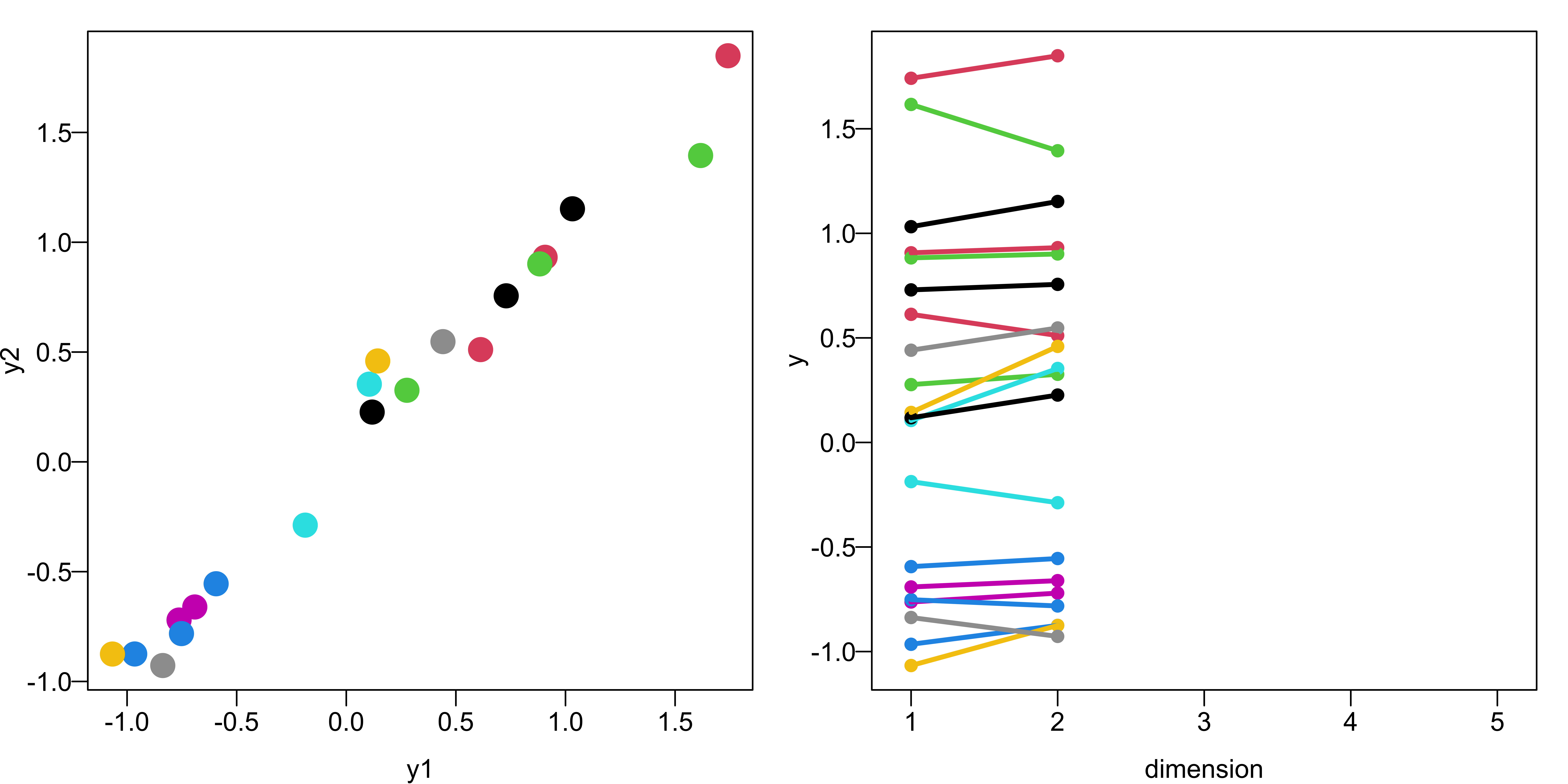 \boldsymbol \mu= \begin{pmatrix} 0 \\ 0 \\ 0\\0\\0\end{pmatrix} \quad \quad \boldsymbol \Sigma= \begin{pmatrix}1 & 0.99 & 0.98 & 0.97 & 0.96\\ 0.99 & 1 & 0.99 & 0.98 & 0.97 \\ 0.98 & 0.99 & 1 & 0.99 & 0.98 \\ 0.97 & 0.98 & 0.97 & 1 & 0.99\\0.96 & 0.97 & 0.98 & 0.99 & 1 \end{pmatrix}