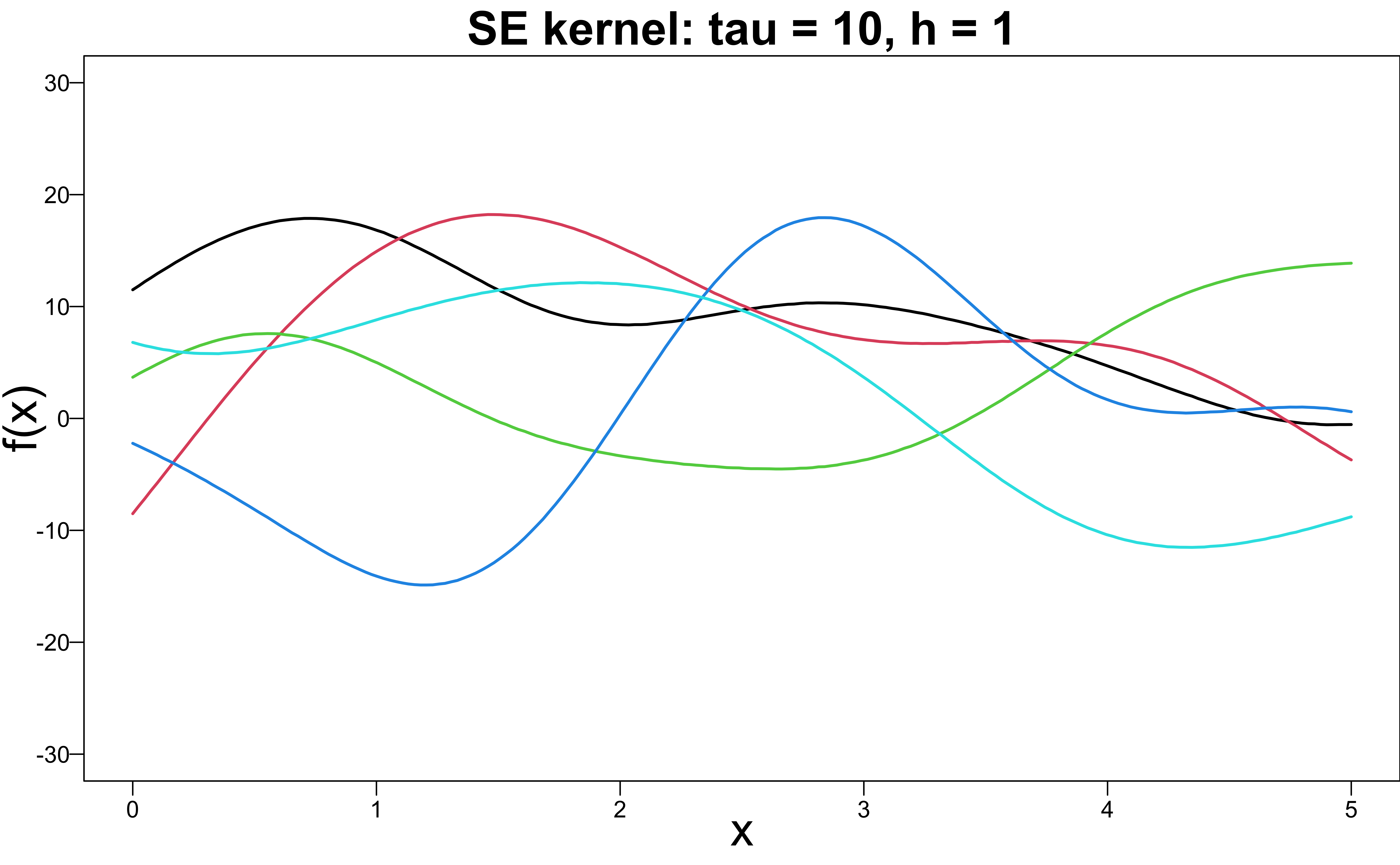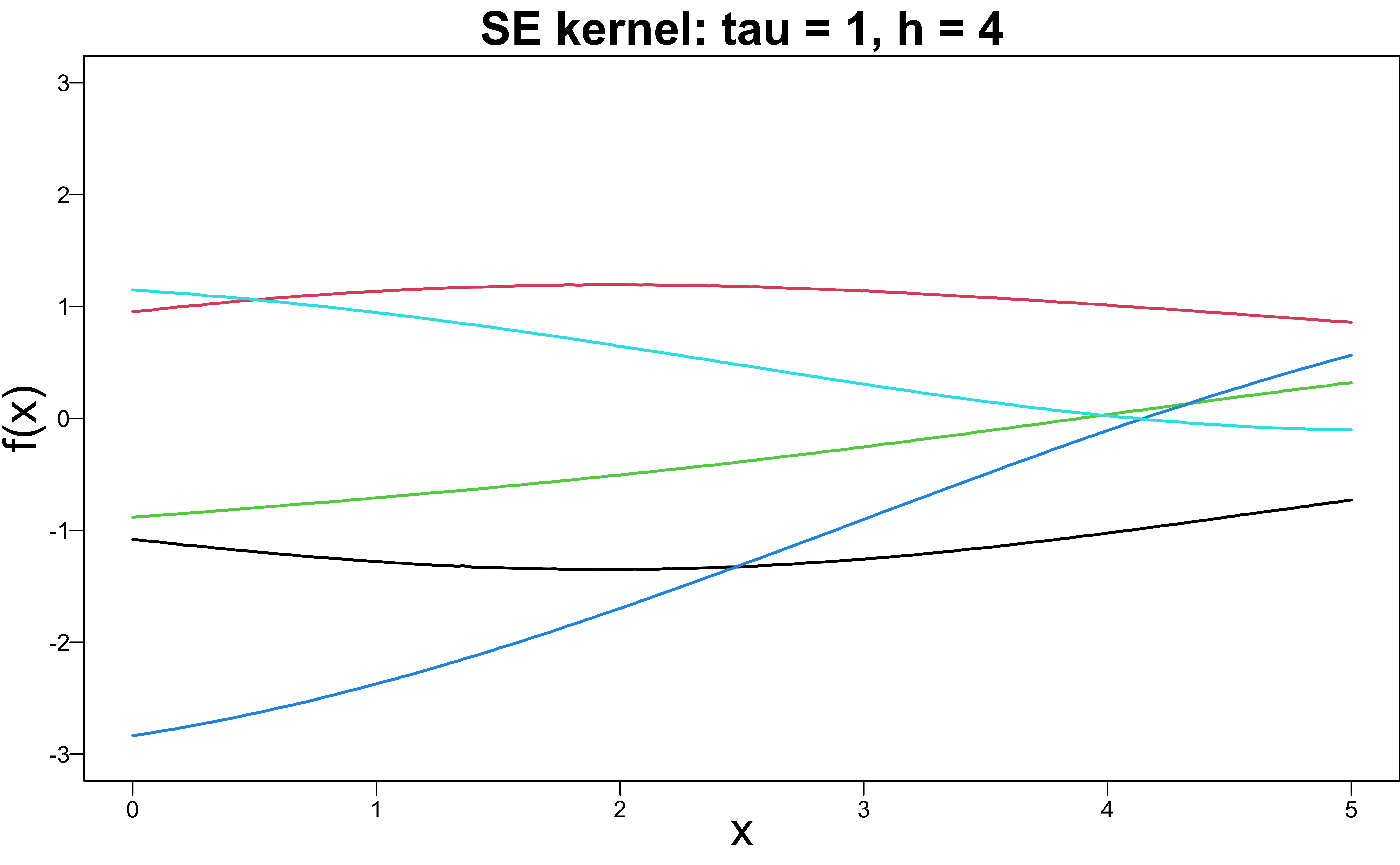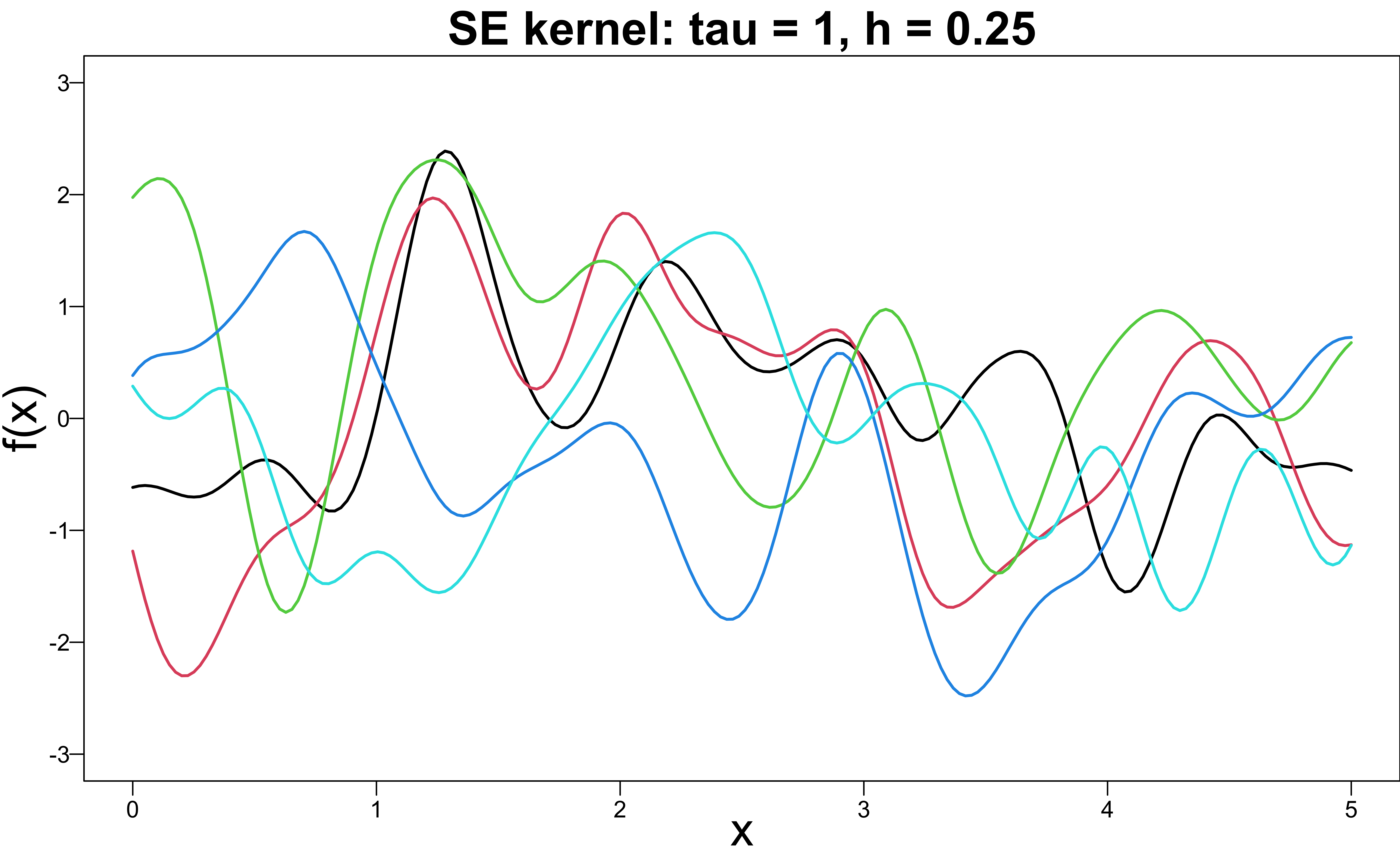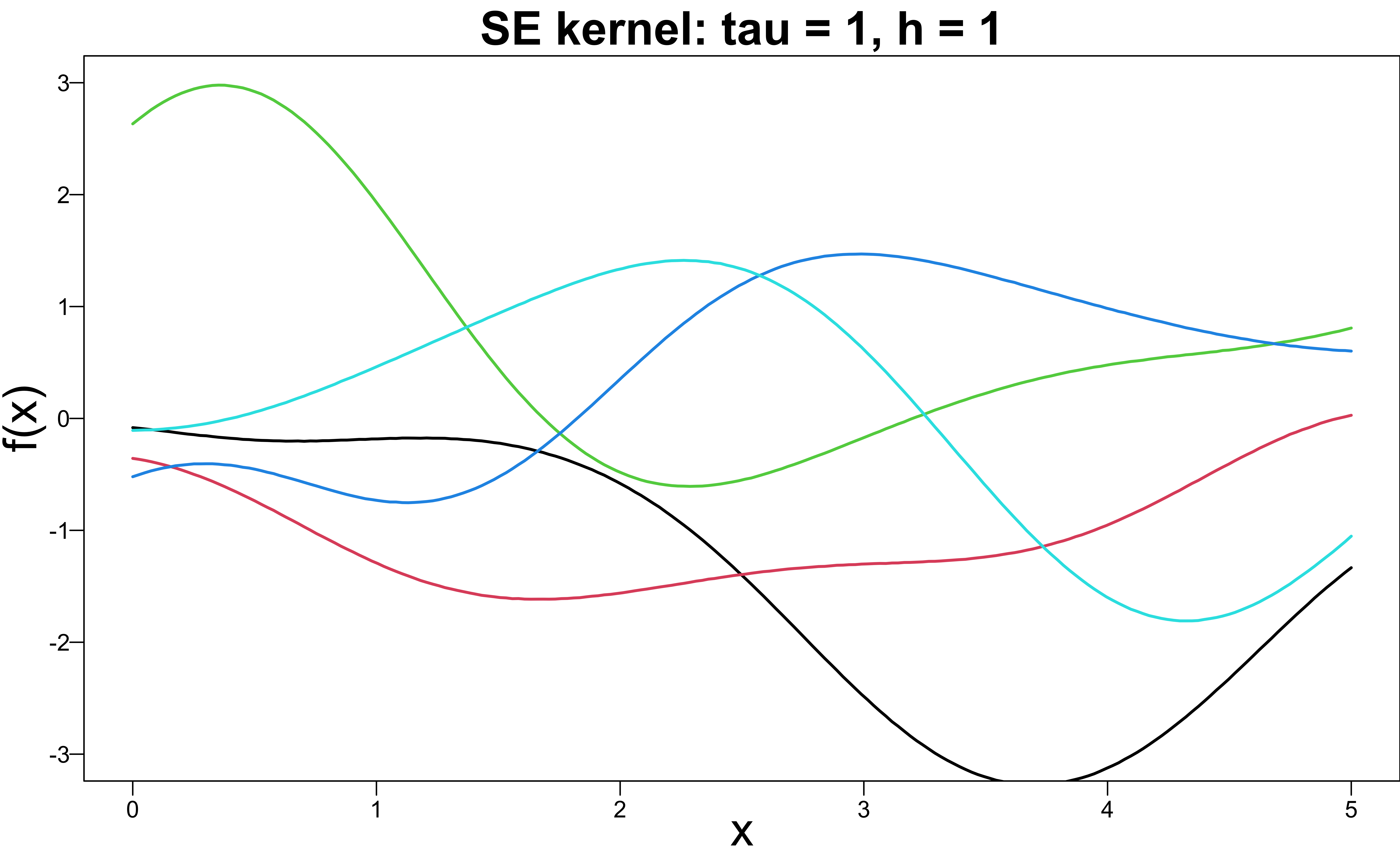 k(x, x' \mid \tau, h) = \tau^2 \exp\left(-\frac{(x - x')^2}{2h^2} \right)