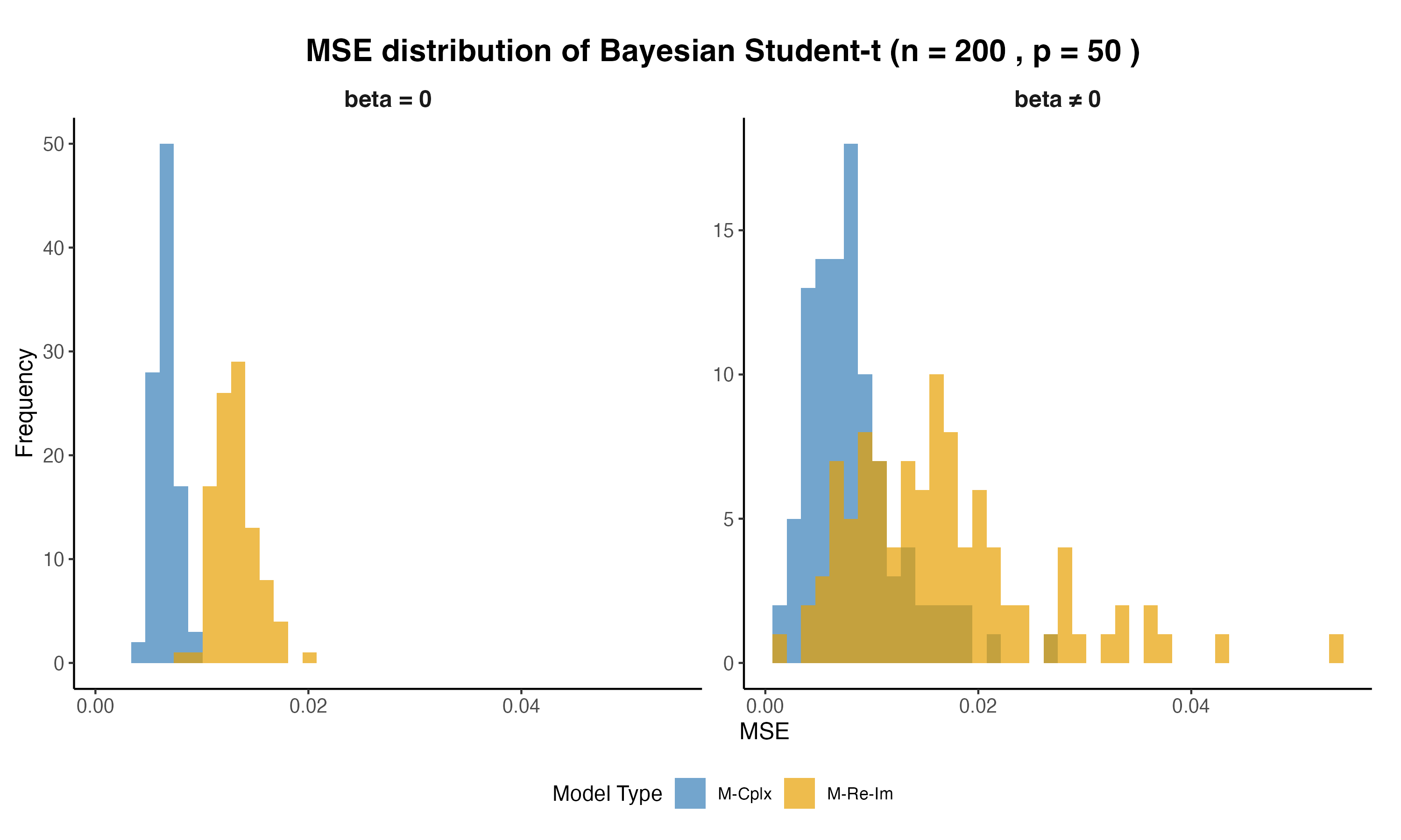 For non-zero \betas, M-Re-Im distributions are more right-skewed with larger variation.