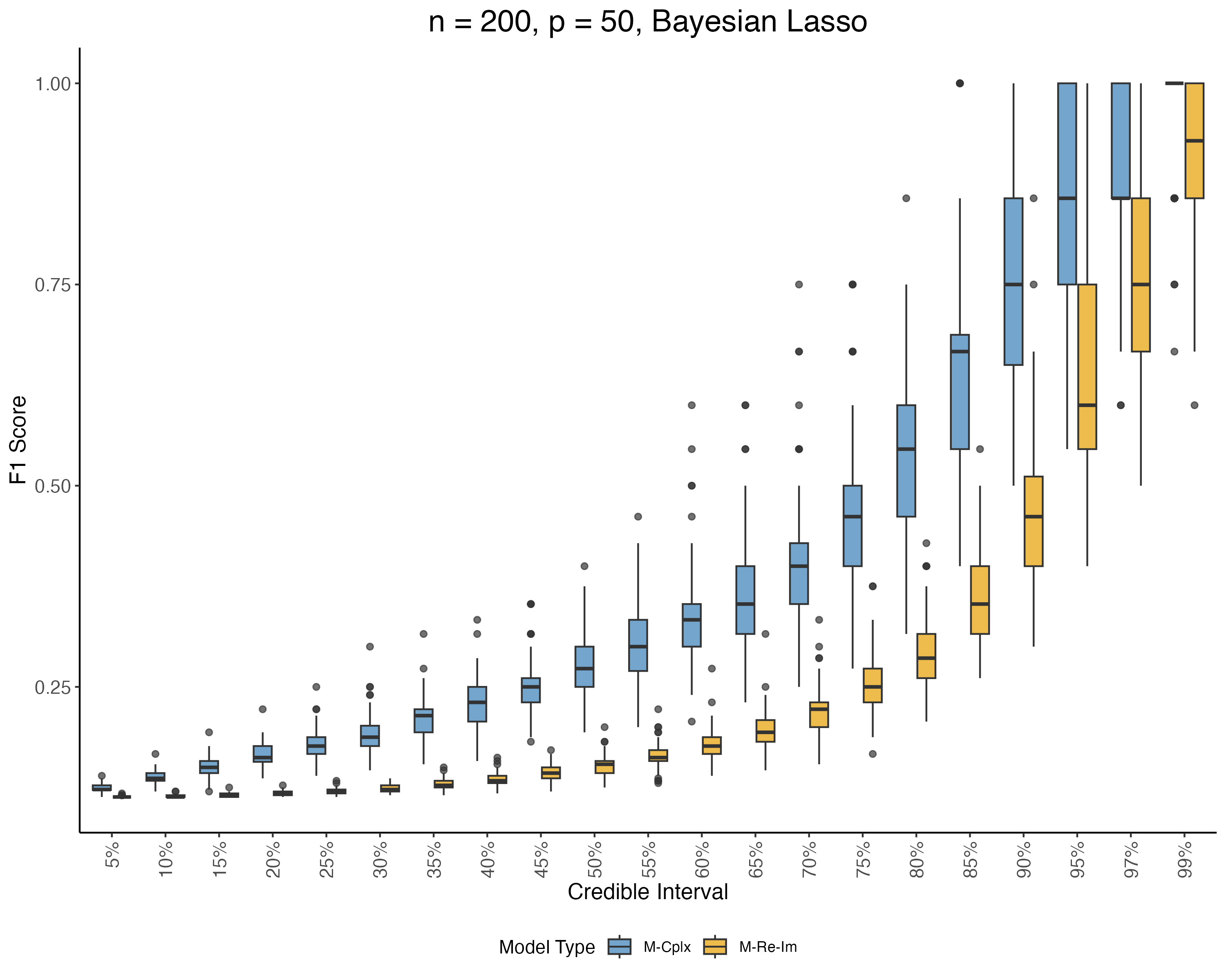 Check whether credible interval for \boldsymbol \beta includes zero or not, then use F-score to evaluate performance.