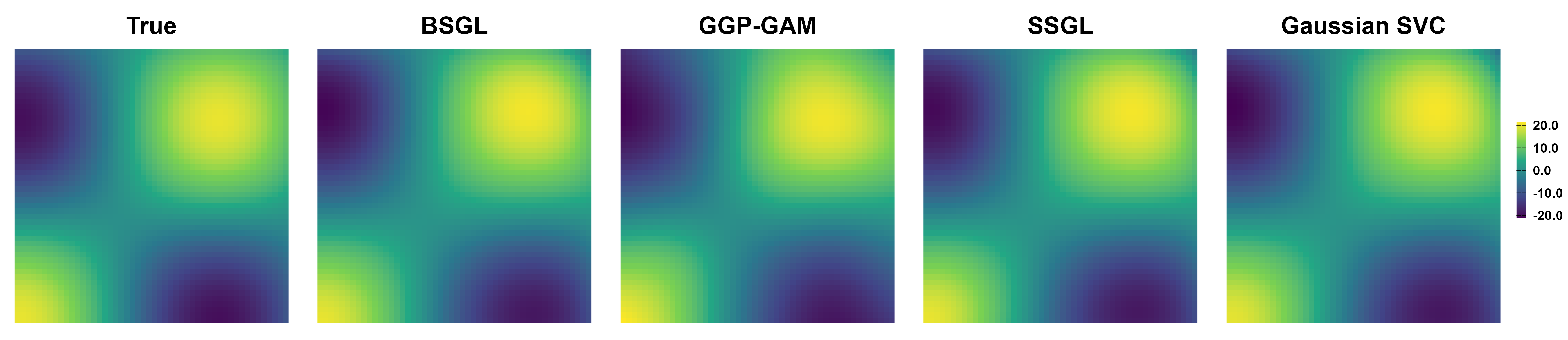 All competing methods recover the main spatial patterns of active predictors with large signals