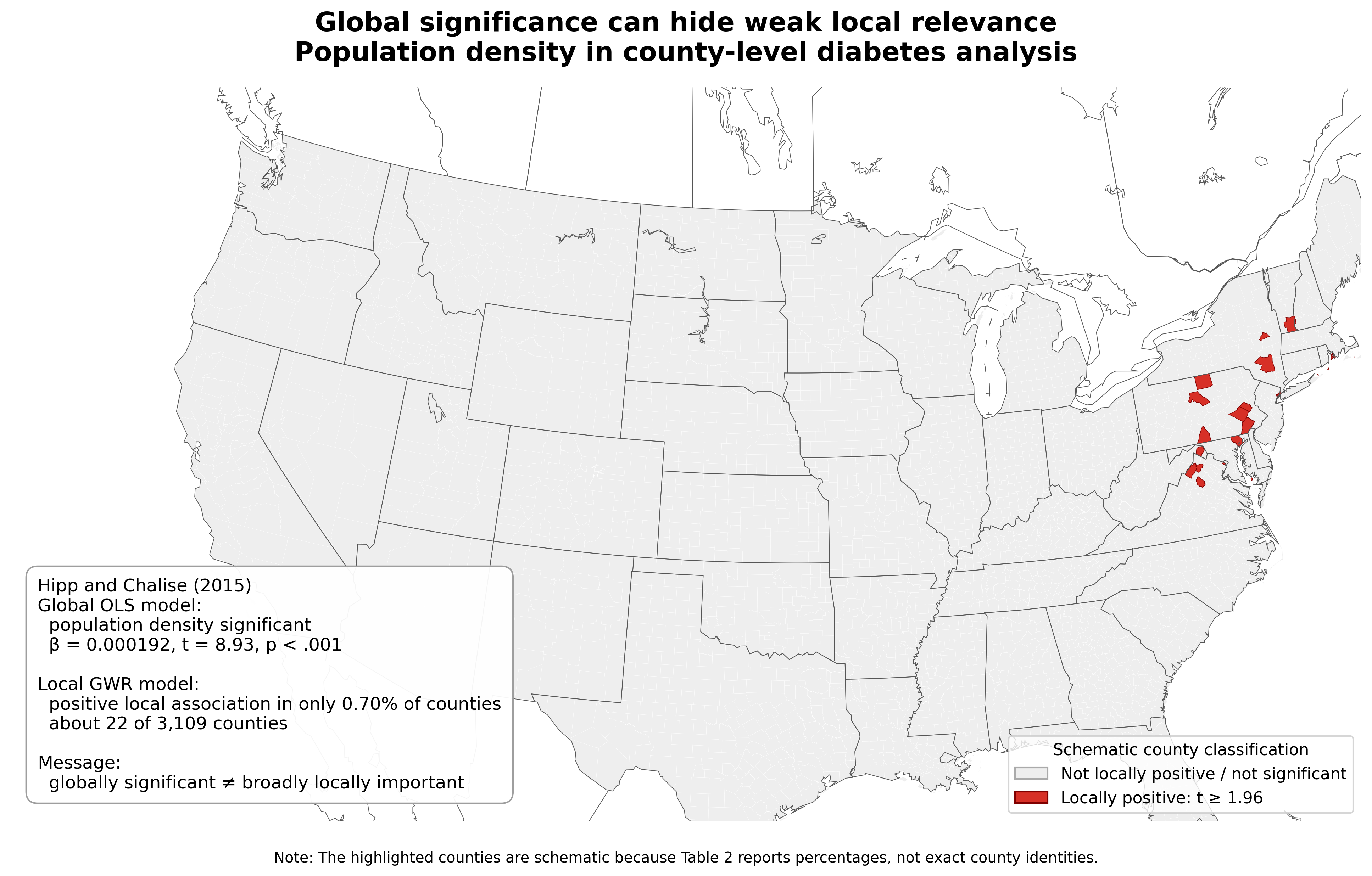 Example. In a county-level diabetes analysis, population density was significant in the model but locally positive in only 0.7% of counties (Hipp and Chalise 2015).