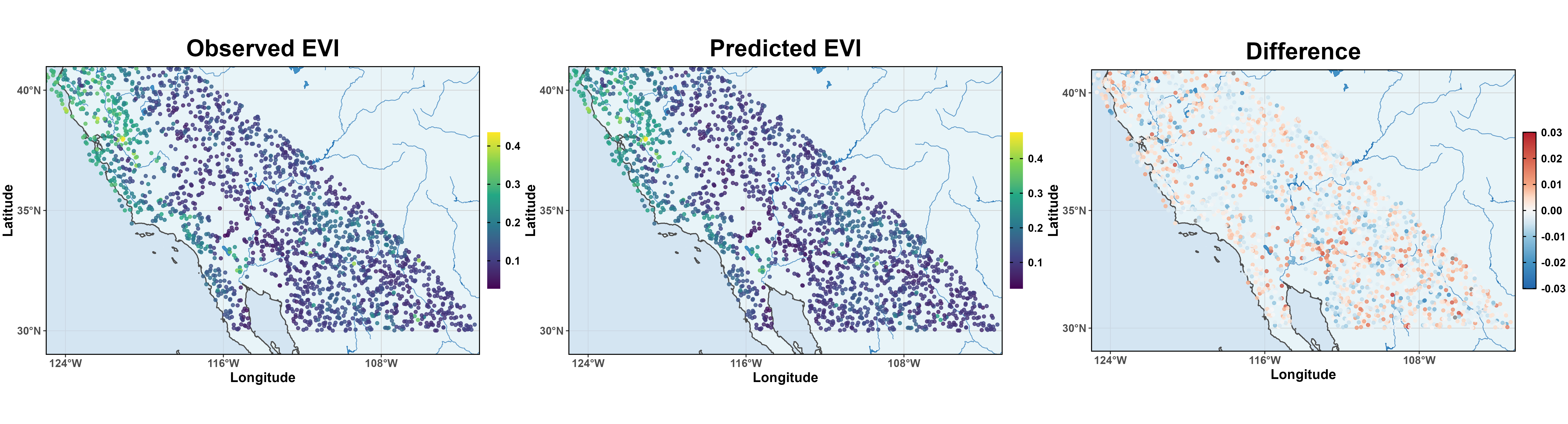 Which predictors have spatially varying associations with EVI?