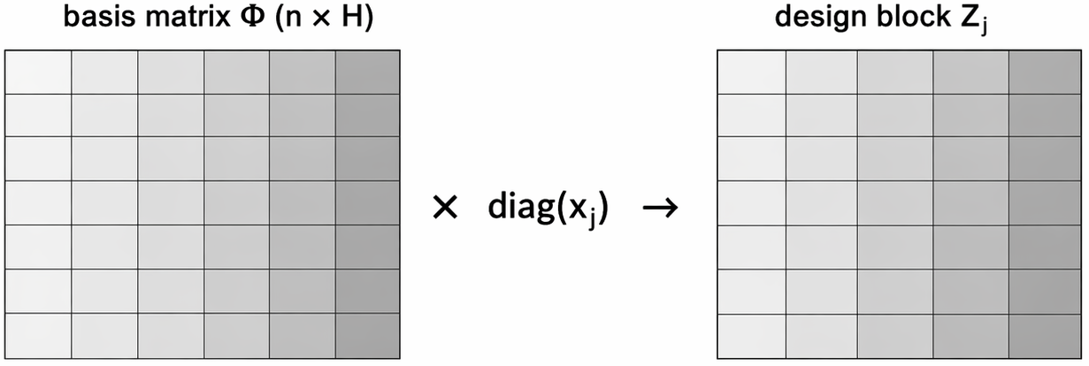 \mathbf{Z} = [\mathbf{Z}_1\ \cdots\ \mathbf{Z}_p], \qquad \mathbf{Z}_j = \operatorname{diag}(x_{1j},\ldots,x_{nj})\,\mathbf{\Phi},