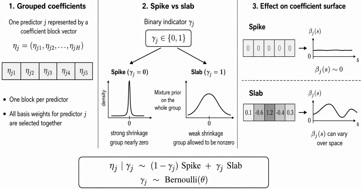 Need: spatial flexibility + predictor-level surface selection + Bayesian uncertainty quantification.