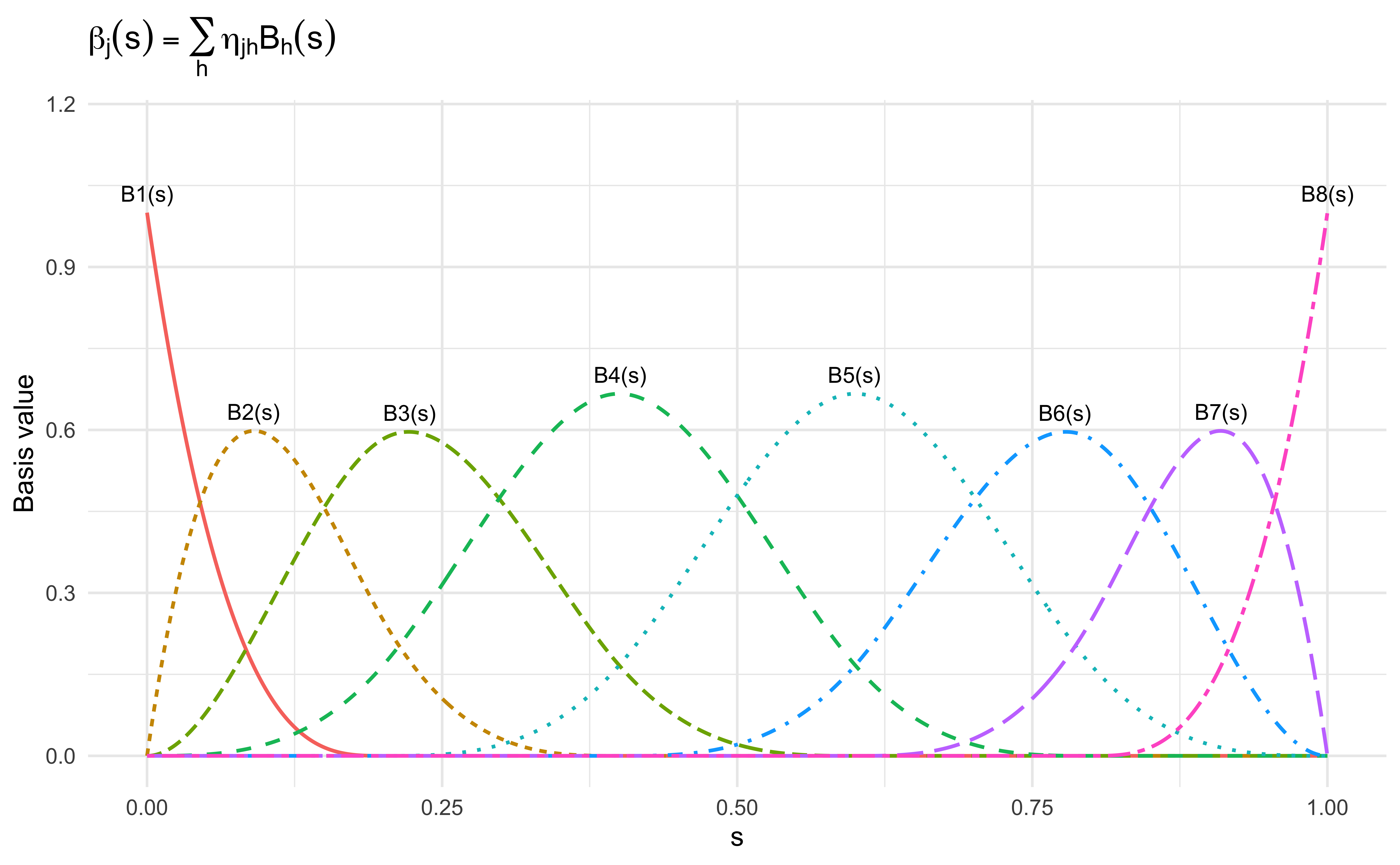 \beta_j(s) = \sum_{h=1}^H B_h(s)\alpha_{jh}, \quad j = 1, \dots, p